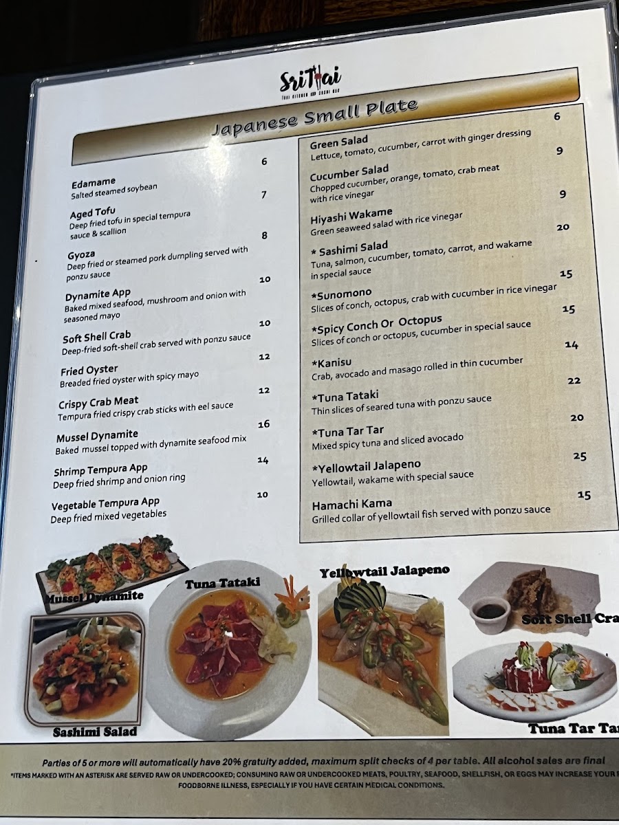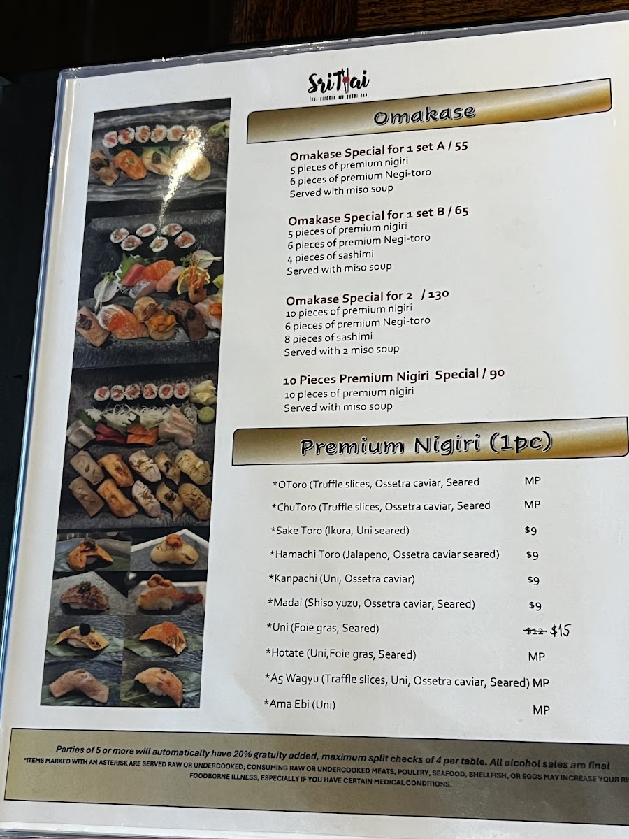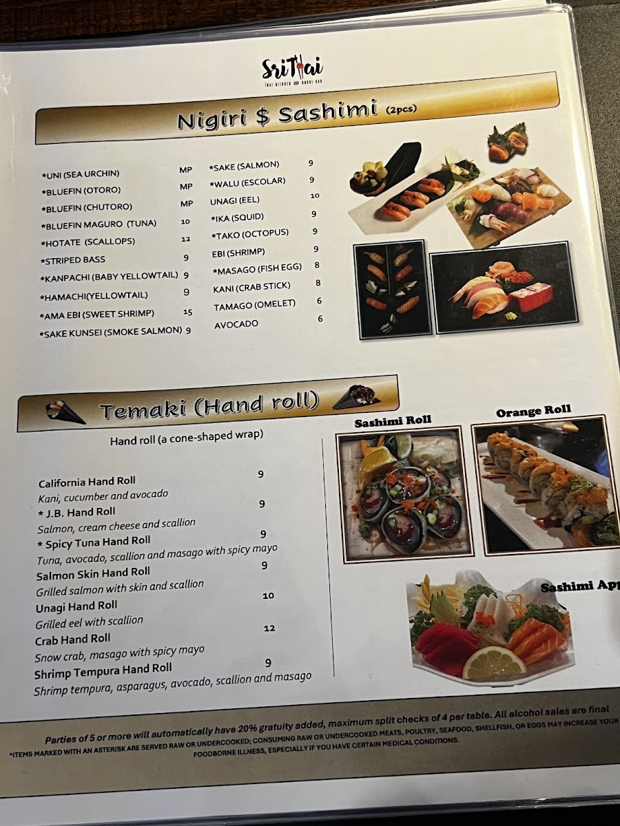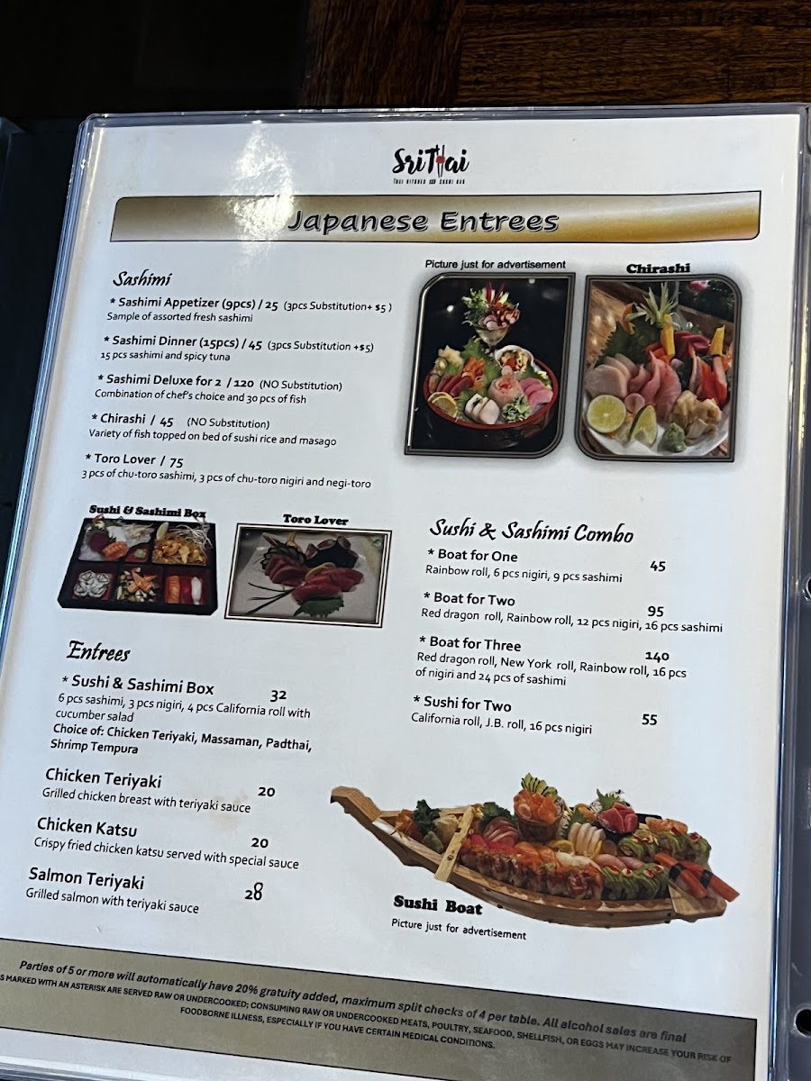 6 pieces of sashimi, 3 pieces nigiri, 4 pieces California roll. Raw/undercooked. Served with rice (Padthai no rice) Choice of Padthai / Massaman / Chicken teriyaki